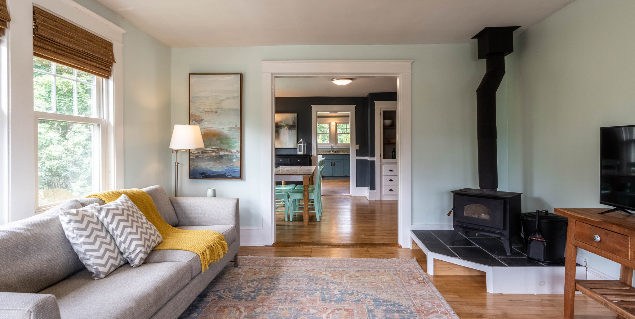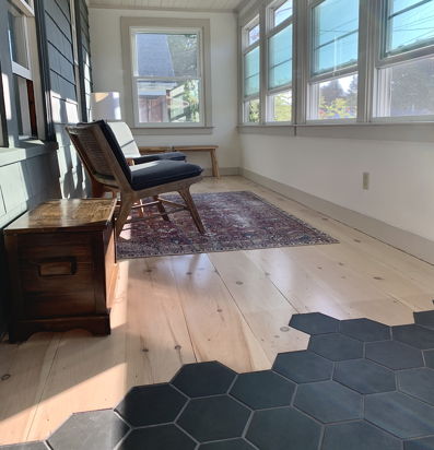 The sunroom’s smile-inducing sea of windows are perched above a sweet honeycomb tile and wide plank pine floor, putting nature’s mood-boosting benefits at your fingertips no matter the season.